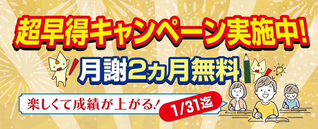 月謝2ヵ月無料、超早得キャンペーン 1/31まで