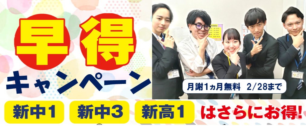 月謝1ヵ月無料、2月の早得キャンペーン 2/28まで