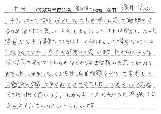 私はベストが学校の近くにあったため帰りに寄って勉強できるのが魅力だと思い、入会しました。ベストは自分に合った学習ができ、得意なところはもっと伸ばし、不得意なところは克服することができるのが良いと思います。だから私は小学校の内容を早めに終わらせ、早くから中学受験の内容に取り組めました。6年生になってからは、応用の問題を中心に学習し、その勉強を受験に生かすことができました。そのおかげで、合格できたのだと思います。これからも、ベストの先生方に感謝しながら、より学力を伸ばしていきたいです。