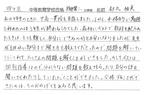 私は4年生のときに、中高一貫校を目指しました。しかし、本格的に勉強し始めたのは5年生が終わるころでした。最初にベストで、教材を配られたときは、とても難しく、自分にできるのかと不安になりましたが、先生が細かい部分まで解き方を教えてくださったので、問題を解いていくにつれて、たくさんの問題を解くことができました。そして、ベストは個別指導なので、わからない問題を教えてもらったり、自分の話を聞いてくれたりしていただくことができました。合格することができたのは、そのおかげでもあると思います。