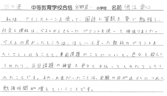 私は、アインストーンを使って、国語と算数を塾で勉強し、社会と理科は、ベストからもらったプリントを使って頑張りました。ベストの良かったところは、ほしいと言った教科のプリントをたくさんくれることと、事前課題のことについて、色々と教えてくれたり、当日課題の練習も色々と手伝ってくれたりしてくれたことです。また、大変だったことは、受験の日が近づくにつれて、勉強時間が増えていくことです。