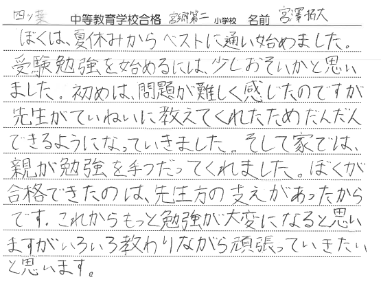 受験勉強を始めるには、少しおそいかと思いました。初めは、問題が難しく感じたのですが先生がていねいに教えてくれたためだんだんできるようになっていきました。そして家では、親が勉強を手つだってくれました。ぼくが合格できたのは、先生方の支えがあったからです。これからもっと勉強が大変になると思いますがいろいろ教わりながら頑張っていきたいと思います。