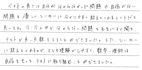 ベストの良さは自分が分からなかった問題や自信がない問題を優しくていねいに分かりやすく教えてくれるところだと思います。ワークの中でわからない問題を先生によく聞き、テストで良い点数をとることができました。また、ていねいに教えてくれるので、とても理解がしやすく、数学・理科は自信をもって、テストに取り組むことができました。