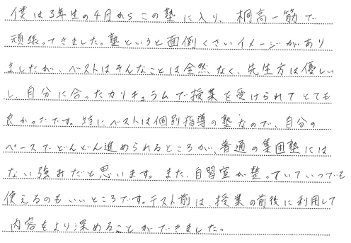 僕は3年生の4月からこの塾に入り、桐高一筋で頑張ってきました。塾というと面倒くさいイメージがありましたが、ベストはそんなことは全然なく、先生方は優しいし、自分に合ったカリキュラムで授業を受けられてとても良かったです。特にベストは個別指導の塾なので、自分のペースでどんどん進められるところが、普通の集団塾にはない強みだと思います。また、自習室が整っていていつでも使えるのもいいところです。テスト前は、授業の前後に利用して内容をより深めることができました。