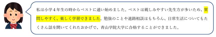 私は小学4年生の時からベストに通い始めました。ベストは親しみやすい先生方が多いため、質問しやすく、楽しく学習できました。勉強のことや進路相談はもちろん、日常生活についてもたくさん話を聞いてくれたおかげで、青山学院大学に合格することができました。