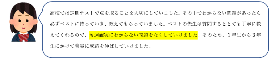 高校では定期テストで点を取ることを大切にしていました。その中でわからない問題があったら必ずベストに持っていき、教えてもらっていました。ベストの先生は質問するととても丁寧に教えてくれるので、毎週確実にわからない問題をなくしていけました。そのため、1年生から3年生にかけて着実に成績を伸ばしていけました。
