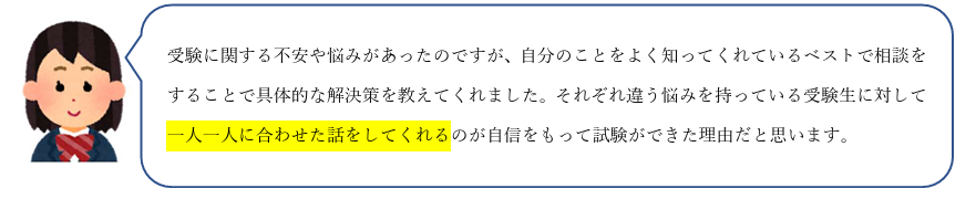 受験に関する不安や悩みがあったのですが、自分のことをよく知ってくれているベストで相談をすることで具体的な解決策を教えてくれました。それぞれ違う悩みを持っている受験生に対して一人一人に合わせた話をしてくれるのが自信を持って試験ができた理由だと思います。
