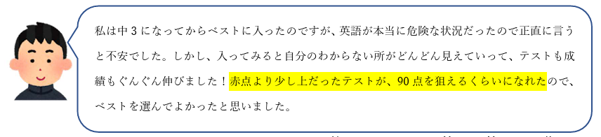 私は中3になってからベストに入ったのですが、英語が本当に危険な状況だったので正直に言うと不安でした。しかし、入ってみると自分のわからない所がどんどん見えていって、テストも成績もぐんぐん伸びました!赤点より少し上だったテストが、90点を狙えるくらいになれたので、ベストを選んで良かったと思いました。
