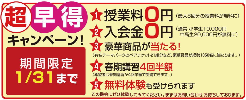 最新のお知らせ 2026.01.05超早得キャンペーン(1/31まで)2025.12.2512/28〜1/4 メールでのお問合せは受付中です2025.12.08冬期講習4回0円(12/27まで)2025.11.17秋の入会キャンペーン(12/6まで)2025.11.052学期の期末テスト対策実施中 コースのご案内 勉強が理解できると、「勉強って楽しい!」に! 小学生コース一覧 成績アップコース はじめての英語コース 思考力養成コース 中学入学準備コース 中学受験対策コース 英検・漢検対策コース 幼児教育コース そろばんコース(そろばん塾ピコ) 個別指導だから、わかるまでしっかり学べる! 中学生コース一覧 定期テスト対策コース らくらく必勝コース 思考力養成コース 英検・漢検対策コース 土曜特訓 年末年始猛特訓 定期テストも大学受験もしっかりサポート! 高校生コース一覧 教科書ぴったりコース 2次受験対策コース 合格実績一覧 受験情報 偏差値ランキング 合格体験記
