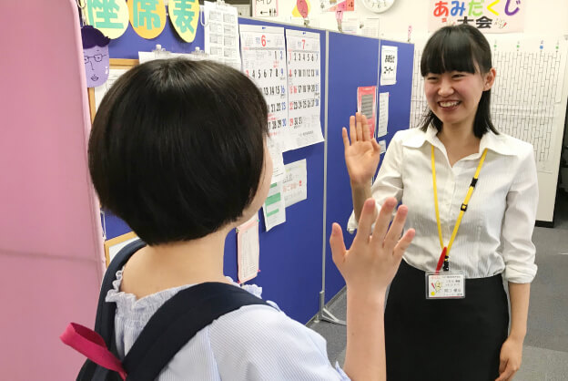 生徒たち元気良く挨拶をしてあげましょう。授業が始まるまでは生徒たちと楽しくコミュニケーションを取り、授業へのモチベーションを上げます。