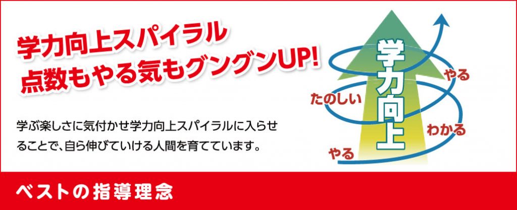 「本来、学ぶことは楽しいことであるという考えのもと、学ぶ楽しさに気付かせ学力向上スパイラルに入らせることで、自ら伸びていける人間を育てる」この指導理念のもとに作り出したのが「ベスト式指導法」です。